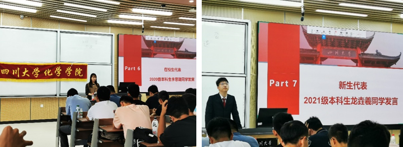 2020级本科生李思璐同学作为在校生代表发言,她讲述了自己在大一的生活与学习,并给学弟学妹们提出建议。曾获化学奥林匹克竞赛银牌的2021级新生代表龙垚羲同学发言,他表达了对家长和老师的诚挚感谢,并表明了认真学习、努力拼搏、不负韶华的决心。