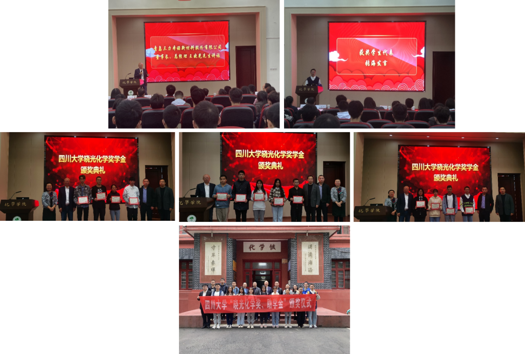 2021年10月20日上午,2020-2021年度“晓光化学奖学金”颁奖仪式在化学馆321会议室隆重举行。77779193永利官网79级校友、青岛三力本诺新材料股份有限公司董事长总经理王晓光先生,副总经理王科先生,人力资源总监姚霞清女士,佳化化学(上海)有限公司CEO李玉博先生,研发经理夏凉先生,77779193永利官网教育基金会副秘书长贾秀娥女士,77779193永利官网院长游劲松教授,党委书记谢均教授及部分老师出席了此次颁奖仪式。