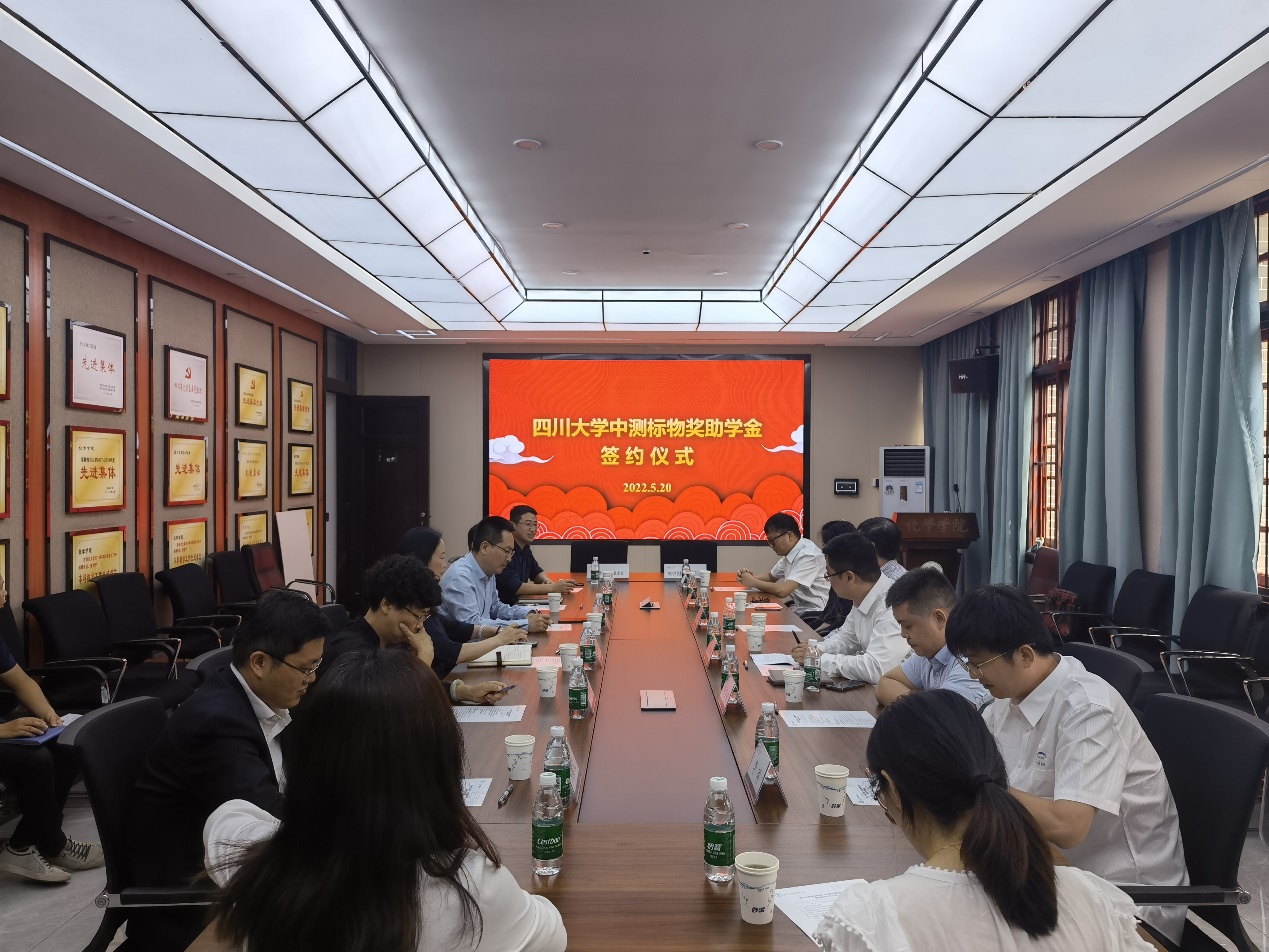 2022年5月20日,77779193永利官网“中测标物奖助学金”捐赠签约仪式在化学馆122会议室成功举行。中国测试技术研究院化学所首席专家方正、四川中测标物科技有限公司总经理杨嘉伟、常务副总经理聂巍、副总经理王显建、总工程师张鹏辉、党支部书记李璞,77779193永利官网教育基金会秘书长陈森,77779193永利官网党委书记谢均、党委副书记肖波、副院长马利建、汪秀丽教授、王健礼教授等参加了签约仪式。
