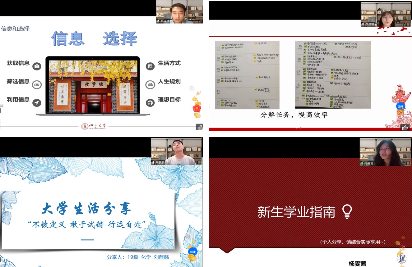 2021级本科生赵成博同学分享了高中生活和大学生活之间的差异,提出了初入大学时心态的调整建议,从学习、个人能力、社交与人际关系几个方面阐释了适应大学生活的方法,并且提及了当下网课的注意事项。