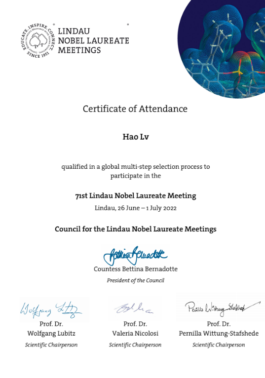 第71届诺贝尔奖获得者大会于2022年6月在德国林岛举办,本届会议主题是化学,尤其聚焦在催化与合成和有机催化方面。永利2020级博士研究生吕浩通过层层选拔,从全国众多知名高校的158名优秀博士生和青年学者候选人中脱颖而出,作为国内最终获得参会资格的30名博士生之一,与30位诺奖得主和来自90个不同国家地区近500位优秀的青年学者们共赴学术盛宴,探讨化学领域科研最新进展。