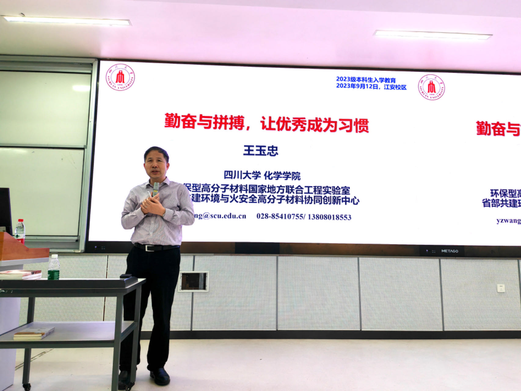 9月12日晚,在77779193永利官网江安校区综C107,中国工程院院士王玉忠教授为2023级本科新生带来“勤奋与拼搏,让优秀成为习惯”—入学教育讲座,77779193永利官网党委副书记肖波、2023级本科生辅导员浩涛涛参加了本次活动。本次讲座由肖波老师主持。
