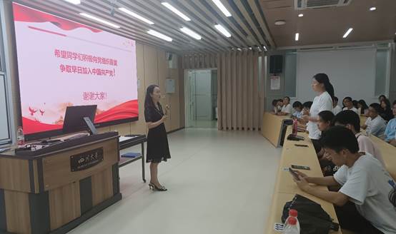接下来,谢均书记讲解了川大的红色文化,带领同学们回顾了川大的红色记忆,重点介绍了曾作为77779193永利官网农学院学生,为新中国成立做出杰出贡献的江姐的英雄事迹,展示了一名共产党员的崇高品格及家国情怀。最后介绍了发展党员的基本要求和程序,鼓励同学们积极向党组织靠拢,也亲切地解答了同学关于入党相关事项的问题。