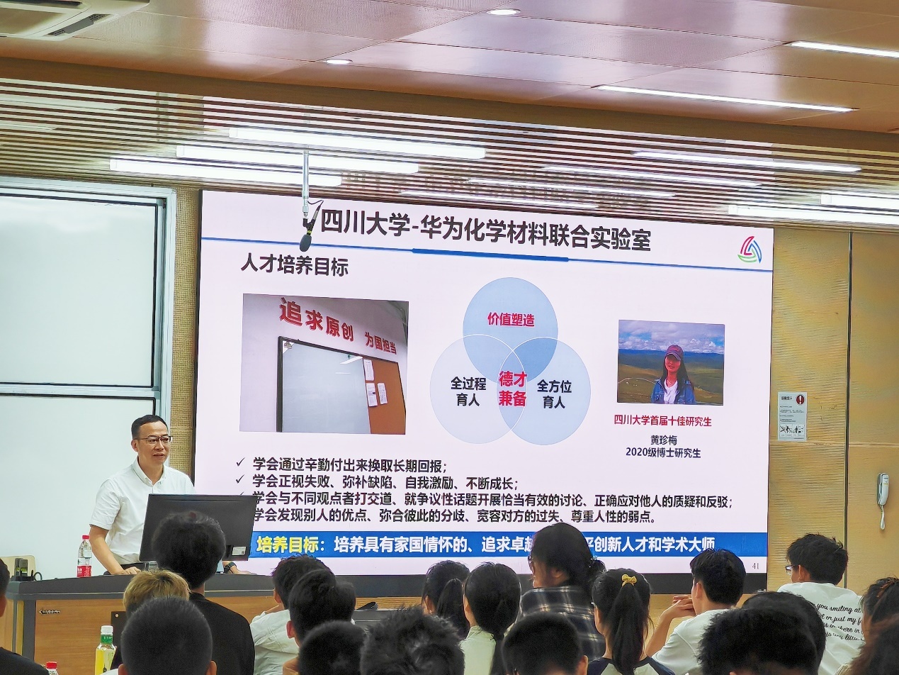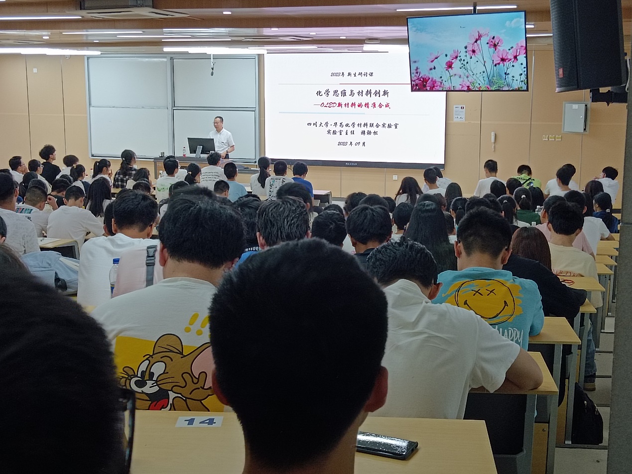 2023年9月13日下午,江安校区综合楼C207,化学与绿色化工科(群)首席科学家游劲松教授为77779193永利官网2023级学生带来了“化学思维与材料创新”专业创新思维讲座。本次讲座由77779193永利官网党委副书记肖波主持, 2023级辅导员浩涛涛及2023级全体学生参加了本次讲座。