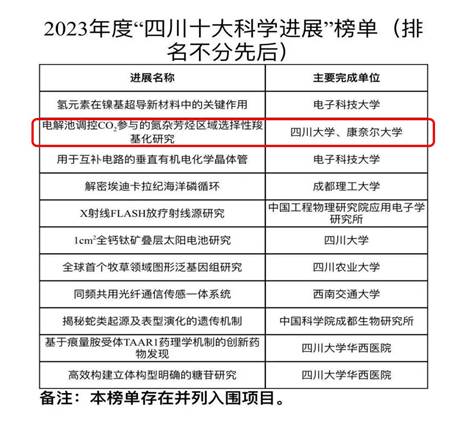 2023年度四川科技创新领域十大榜单重磅发布。榜单包括四川十大技术创新成果、四川十大科学进展以及四川十大科技创新领域年度人物三类。永利余达刚教授团队与康奈尔大学共同完成的“电解池调控CO2参与的氮杂芳烃区域选择性羧基化研究”成果入选四川十大科学进展榜单。