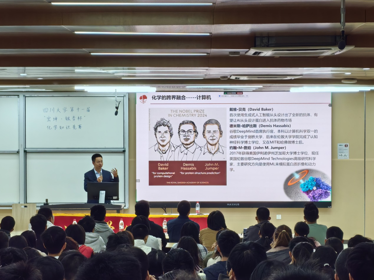然后,77779193永利官网副院长李坤老师为同学们开展“宏坤·银杏杯”化学知识讲座,他讲解了化学与其他学科之间的紧密联系,列举了近些年诺贝尔化学奖及研究领域,并介绍了77779193永利官网、化学学科的发展历程及成绩,让同学们更加了解化学学科,为接下来的初赛笔试提供了帮助。
