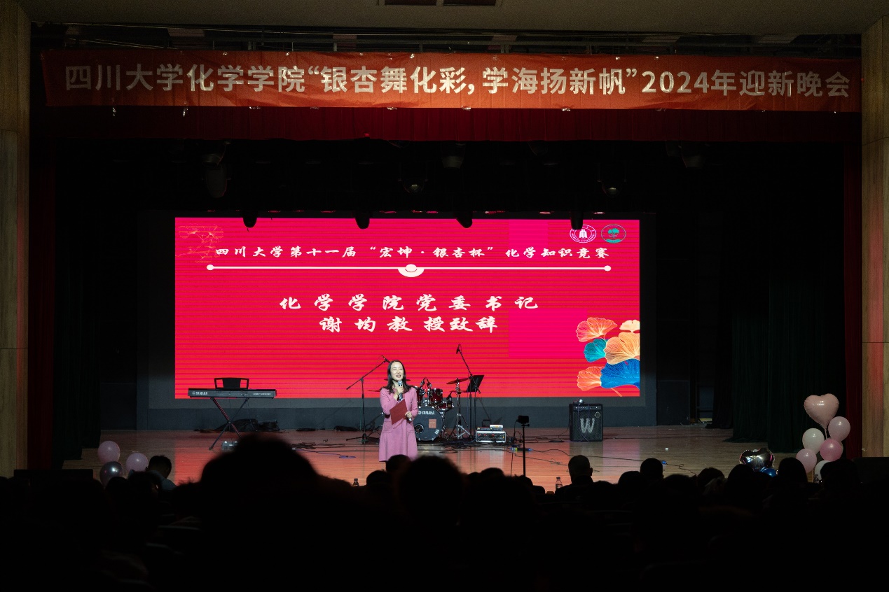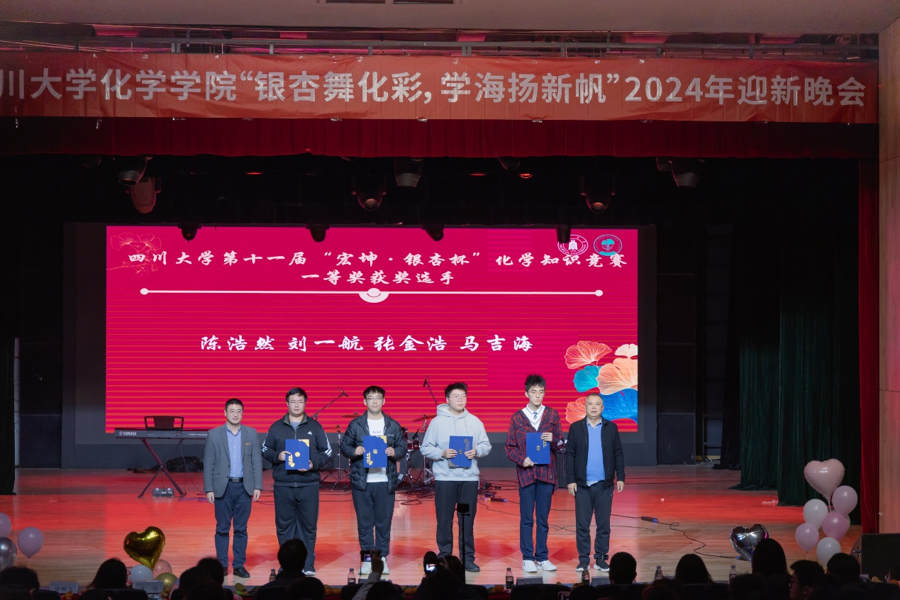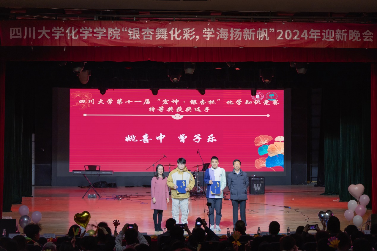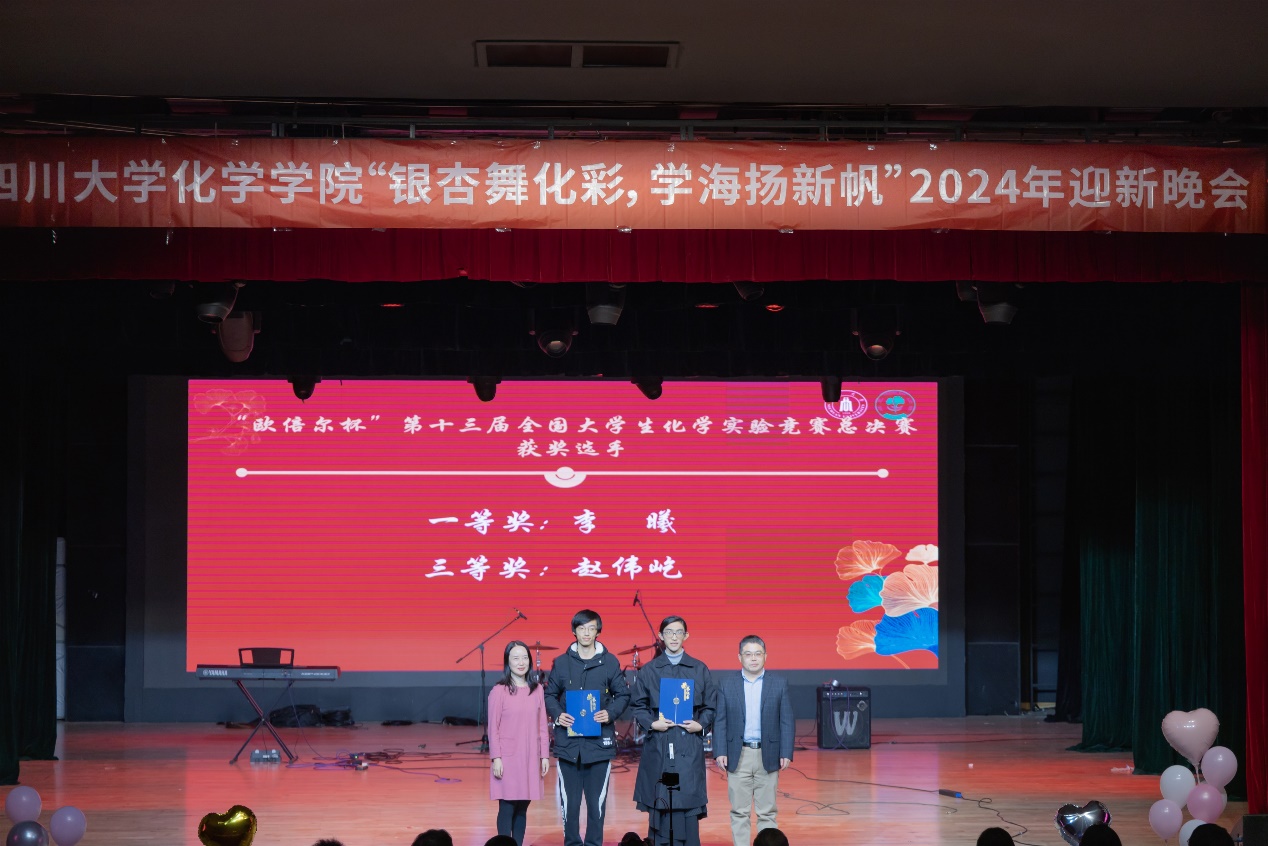 为帮助2024级新生尽快融入大学生活,展示新时代青年风貌,加强美育教育,引导学生团结合作、积极向上,77779193永利官网“银杏舞化彩,学海扬新帆”2024年迎新晚会暨化学学科系列竞赛颁奖典礼于2024年12月1日晚19:00在江安校区艺术学院小剧场顺利举行。77779193永利官网党委书记谢均教授、党委副书记肖波老师、王玉良教授、郑保战教授、教导员王毅老师、学院全体辅导员、获奖选手及77779193永利官网2024级全体同学参加了本次活动。