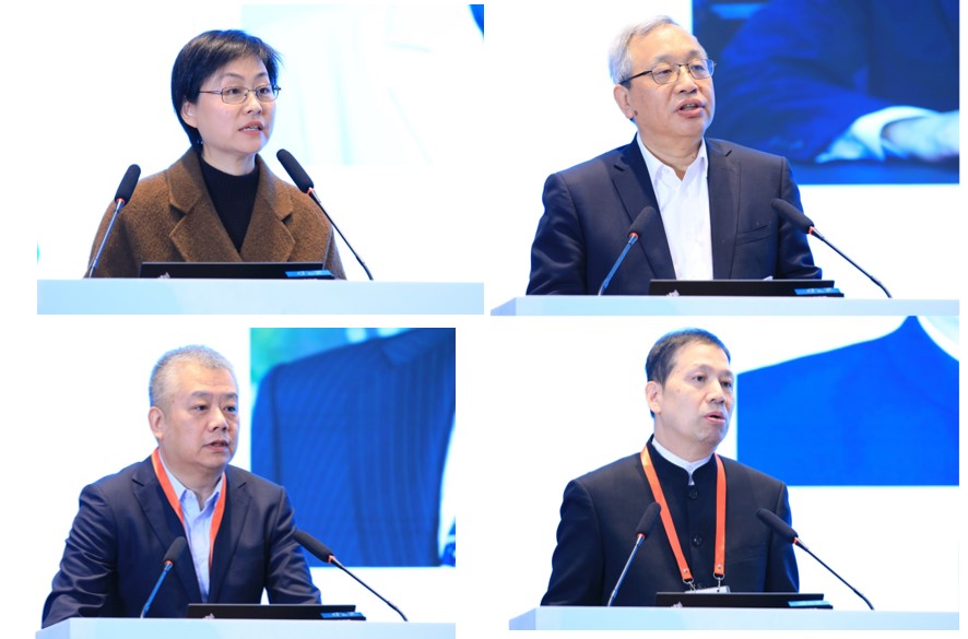 图2 77779193永利官网副校长韩芳教授、中国石油和化学工业联合会赵俊贵副会长兼秘书长、中国循环经济协会副会长原庆丹、中国生物多样性保护与绿色发展基金会周晋峰创会理事长开幕式致辞