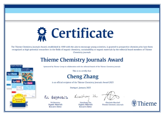 据悉,“Thieme Chemistry Journals Award”学术奖设立于1999年,每年颁发一次,面向来自全世界处于独立学术研究生涯早期、崭露头角的科研人员,获奖者由Synthesis、Synlett和Synfacts的期刊编辑委员会成员独家评选。该奖项关注从事有机化学合成与催化,以及在有机化学密切相关领域中有潜力的青年学者,旨在表彰和鼓励新一代有机化学家的科研成果。2025年度,全球范围内共有93人荣获“Thieme Chemistry Journals Award”学术奖。