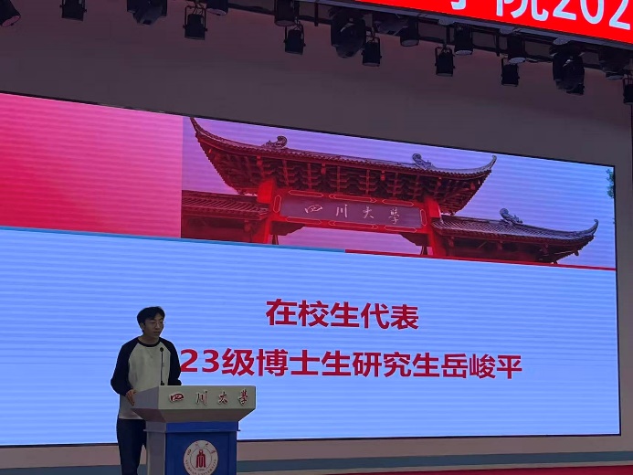 在校生代表2023级博士研究生岳峻平结合自身学习和科研经历,分享了对研究生生活的体会。他强调要学会接纳科研过程中的失败与挫折,主动与导师、同学沟通,积极面对挑战,才能不断突破自我,积累成长。