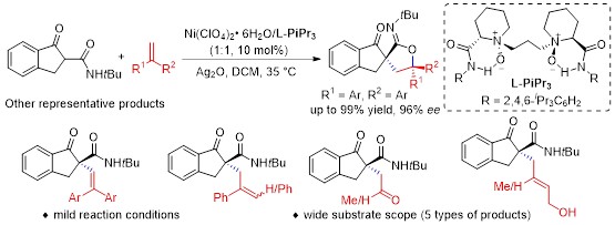 近日,77779193永利官网冯小明教授课题组结合手性双氮氧(L-PiPr3)-Ni(II)配合物催化剂和Ag2O,成功实现了茚酮甲酰胺、酯与富电子烯烃的催化不对称自由基-偶极交叉反应。羰基a位对醛、酮的不对称亲核加成反应在过去几十年被广泛研究。文献报道通过单电子氧化可以实现羰基a位的极性反转,生成亲电型的a-碳自由基,这极大丰富了羰基化学在有机合成中的应用。然而,由于自由基的反应活性高,副反应多,背景反应强等特点,实现高对映选择性不对称催化反应仍具有很大挑战。尽管目前已经发展了一些创造性的催化模式和策略来促进羰基a-碳自由基参与催化不对称反应,但存在催化剂的用量高,催化模式单一,底物的普适性不好,反应结果差等缺点。在本文中,他们利用课题组发展的手性[Ni-L-PiPr3]*配合物作为手性Lewis酸催化剂,高收率、高对映选择性的实现了不对称自由基-偶极交叉反应。各类烯烃和茚酮甲酰胺经历自由基加成、环化反应得到一系列螺环亚胺内脂以及螺环内脂类化合物。同时,根据所使用的富电子烯烃的不同,可以利用同一催化体系得到手性烯烃、醛、酮、醇四种不同类型的产物。在机理研究上,利用TEMPO捕获到了自由基中间体,并且通过自由基钟与EPR实验证明了自由基机理的合理性。