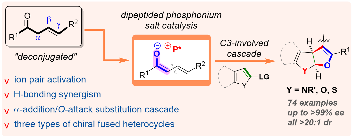 永利王天利教授课题组一直致力于手性肽-季鏻盐催化的不对称合成化学研究,开发了一系列新型高效的多功能手性肽-季鏻盐催化剂、及其催化的新合成方法学。针对上述科学挑战,该团队利用二肽-季鏻盐作为手性催化剂,首次实现了b, g-不饱和酮作为一类新型C3-合成子参与的不对称串联反应,高效高选择性地构建了三类二氢呋喃并[2,3-b]杂环化合物。