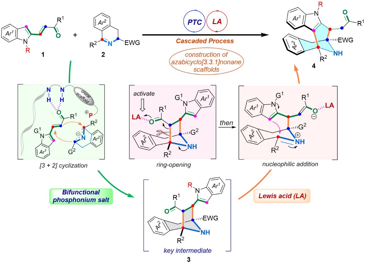 永利王天利课题组一直致力于手性肽-季鏻盐催化的不对称合成化学研究,开发了一系列新型高效的手性肽-季鏻盐催化剂,并成功用于若干富有挑战的有机反应中(例如Angew. Chem., Int. Ed. 2019, 58, 7425-7430;Angew.Chem. Int.Ed. 2021, 60, 14921-14930;Angew. Chem. Int. Ed. 2021, 60, 19860-19870等)。针对上述科学问题并结合课题组前期在构建手性[3.2.1]氮杂七元桥环的研究基础 (Sci. China Chem. 2020, 63, 1091-1099),最近该课题组首次利用双功能季鏻盐催化剂和路易斯酸接力催化策略,以季鏻盐催化串联环化反应得到七元桥环中间体,随后路易斯酸促进该中间体原位开环/扩环,高效高立体选择性的构建了具有多个手性中心的[3.3.1]型氮杂八元桥环骨架。