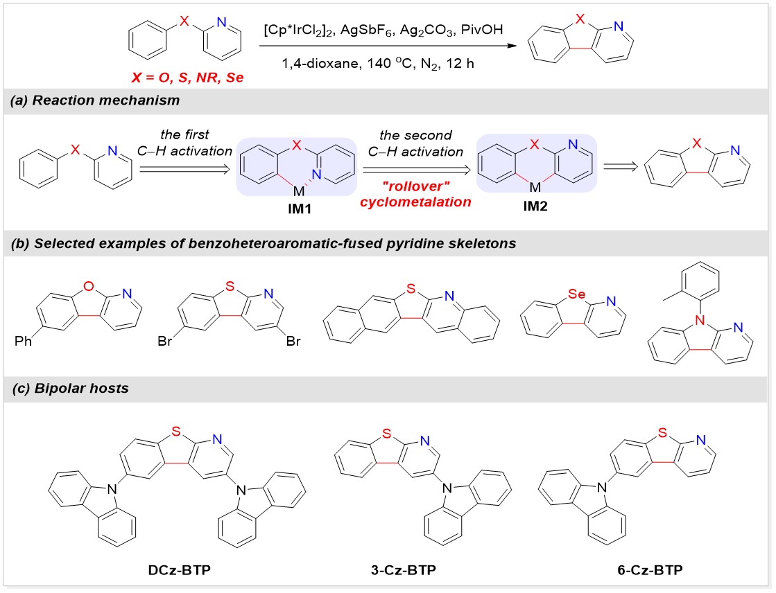 77779193永利官网游劲松教授、宾正杨副研究员团队致力于利用C−H活化策略构筑非传统结构的OLED新材料,以突破OLED材料结构和性能瓶颈。近期,游劲松教授和宾正杨副研究员等基于“翻转环金属化”策略发展了一种铱催化的分子内氧化C−H/C−H偶联反应,高效构筑了吡啶并杂芳环类分子骨架,为蓝光OLED主体材料的开发提供了丰富的分子库。作为一个例子,作者开发了一系列基于吡啶并苯并噻吩结构的双极性主体材料(DCz-BTP,3-Cz-BTP和6-Cz-BTP),其中吡啶环的引入有利于形成强的分子间氢键相互作用,从而显著改善主体材料的传输性能,进而降低器件驱动电压,提高器件效率。
