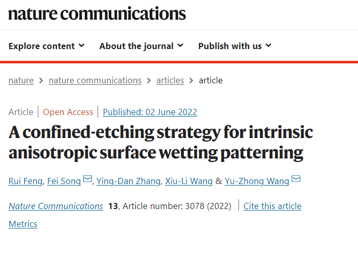 近日,永利王玉忠院士和宋飞教授在Nature Communications上发表题为“A Confined-Etching Strategy for Intrinsic Anisotropic Surface Wetting Patterning”的研究论文(Nat. Commun. 2022, 13, 3078)。77779193永利官网为论文唯一署名单位,77779193永利官网环保型高分子材料国家地方联合工程实验室2019级博士研究生冯蕊为论文第一作者,王玉忠教授和宋飞教授为通讯作者。