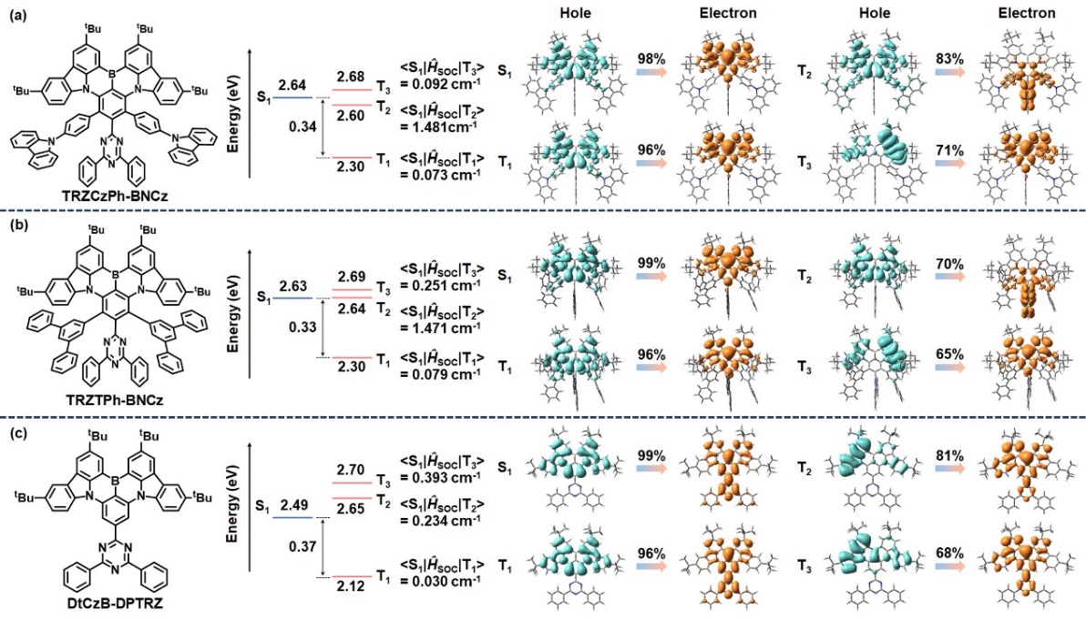 近日,77779193永利官网游劲松教授、宾正杨副研究员团队发展了一种基于“空间限制的给受体”策略以提高MR-TADF分子kRISC,在保持较窄发光半峰宽的前提下,成功将MR-TADF分子的kRISC提高至106 s-1。在分子DtCzB-DPTRZ的基础上,基于“空间限制的给受体”策略发展了新型MR-TADF分子TRZCzPh-BNCz和TRZTPh-BNCz。理论计算研究发现,通过引入空间限制的给受体基团,可以降低MR-TADF分子的T2和T3能级,进而使其接近S1能级,从而打开了从中间的T2/T3态到S1态的高效上转换通道。同时,通过引入空间限制的给受体基团,TRZCzPh-BNCz和TRZTPh-BNCz的S1态的跃迁特征与其T2或T3态的跃迁特征有较大的差异,造成其自旋轨道耦合SOCS1-T2和SOCS1-T3相对较大,使得激子从T2或T3态的反系间窜越过程更加高效,最终将kRISC从DtCzB-DPTRZ的103 s-1数量级提升到TRZCzPh-BNCz和TRZTPh-BNCz的106 s-1数量级。