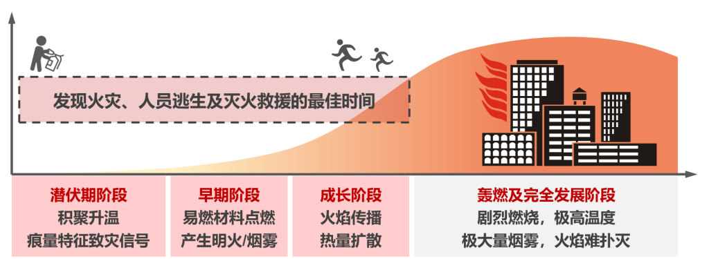 现代社会的快速发展带来了巨大的火灾安全隐患。火灾探测是抵御火灾危害的第一道防线,是变“被动灭火”为“主动防火”,防火于未燃的有效措施;及时发现火情并处置,能大幅降低火灾危害,减少财产损失和人员伤亡。火灾的形成可以分为潜伏期、早期、成长、轰然和完全发展阶段(图1),目前大多数火灾探测器通常是对火灾早期、发展和轰然阶段所产生的异常温度,烟雾颗粒以及火焰光进行监测,然而当产生这些信号时,往往不可逆的灾害已经发生。