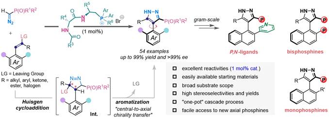 近日,永利王天利教授团队以多功能手性肽季鏻盐作为催化剂,首次利用不对称Huisgen环化/芳构化的串联反应实现了一系列轴手性芳基-吡唑含膦化合物的高效不对称合成。该反应是通过Huisgen类型的环加成和碳中心手性-轴手性转变的芳构化过程进行,且仅需1 mol%的催化剂负载量就能以高产率、优秀的对映选择性获得一系列芳基-吡唑轴手性膦化合物,该反应为快速构建基于吡唑的轴手性芳基膦化合物提供了新方法。最后将产物进行简单的转化制备单/双膦轴手性配体,将其应用于钯催化不对称烯丙基化和胺化中,并取得优秀的分离收率和高的对映选择性;同时,铑催化不对称芳基硼酸的1,4-加成也取得较满意的结果。机理研究表明,产物立体控制的关键在于反应产生了鏻盐稳定重氮膦酸酯阴离子的手性环境和具有多个氢键稳定的手性半封闭腔结构。