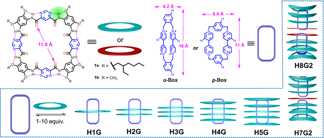 近日,永利袁立华教授课题组与杨成教授、深圳大学化学与环境工程学院李霄鹏教授合作, 利用含有嘧啶结构单元的氢键芳酰胺大环1a与阳离子环番客体(o-Box/p-Box)成功构筑了一类结构新颖的环套环组装体H4G和H5G及其高阶离散型二聚体H7G2和H8G2。在对环套环主客体复合物的单晶进行解析时,作者发现大环1a骨架发生了一系列连续变化的构象适应特征。此外,阳离子环番客体(p-Box)在H5G中客体表现为与H4G中不同的构象,表明在环套环主客体复合物中,客体也具有一定的构象适应性。环套环体系的构象适应性与整个超分子结构的稳定化有关,而后者取决于体系中多重非共价作用的协同结果。根据此现象,通过控制大环的当量,该团队成功构筑了由七个或八个大环1a与两个o-Box/p-Box组成的高阶复合物,即H7G2和H8G2。在离散型环套环二聚体晶体结构中,多个大环通过调整自身构象以使分子间相互作用力达到最大,以确保H7G2/H8G2型二聚复合物的形成,有效避免了超分子聚合物的形成。这与H4G/H5G中观察到o-Box呈现的两种不同构象相互呼应,表明环套环体系中的构象适应性可以由主、客体双方互相诱导而产生。该研究结果展现出二维氢键大环用于构筑高阶环套环组装体所具有的独特性,有助于理解高阶纳米组装体形成过程中涉及到的界面作用及构象适应性现象。
