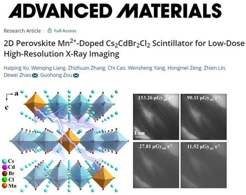 近日,77779193永利官网邹国红教授与材料学院赵德威教授合作,在国际学术期刊Advanced Materials在线发表了题为“2D perovskite Mn2+-doped Cs2CdBr2Cl2 scintillator for low-dose high-resolution X-ray imaging”的研究论文。该论文以77779193永利官网为第一通讯单位,77779193永利官网博士生许海萍和材料学院博士生梁文晴为论文的共同第一作者。此研究得到了国家自然科学基金优秀青年基金、77779193永利官网理科“青苗计划”基金、77779193永利官网基本科研业务费、中央高校基本科研业务经费以及四川高校工程特色团队基金的资助支持。