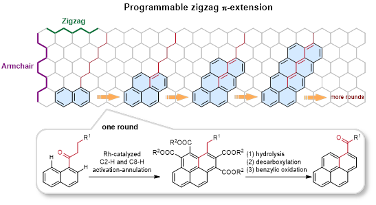 近年来,77779193永利官网游劲松教授团队基于酮羰基的弱配位能力及酮-烯醇互变现象,已经发展了一系列具有鲜明研究特色的烷基芳基酮与炔烃之间的C‒H键活化/环化反应,构筑了结构多样的纯碳及氧鎓掺杂的多环芳烃分子(Angew. Chem. Int. Ed., 2021, 60, 12371;Angew. Chem. Int. Ed., 2019, 58, 302;Nat. Commun., 2019, 10, 5664;Angew. Chem. Int. Ed. 2017, 56, 13094;Angew. Chem. Int. Ed., 2017, 56, 4286;Nat. Commun., 2014, 5, 5030)。基于这些研究基础,近日,永利游劲松教授提出了一种基于碳氢键环化反应实现精准可控的锯齿形类石墨烯分子的高效构筑及定向π-拓展的合成策略。通过利用1-萘酮类化合物为底物,与丁炔二酸酯的顺序的C2‒H和C8‒H活化/环化反应,可以实现萘结构单元的高效构筑及沿着酮烷基链方向迭代延伸,进而实现锯齿形π体系拓展。该策略为可控合成结构多样的锯齿型类石墨烯分子提供了一种简洁、高效的合成途径。基于控制实验和DFT计算,作者提出了该反应的可能路径,即串联的[4+2]/[4+2]C‒H键活化/环化反应。值得注意的是,传统的芳香酮类与炔的C‒H键活化/环化反应通常经过亲电加成或还原消除生成茚醇、富烯和吡喃鎓等产物,而该反应是经过芳香酮的C(sp3)–H的环化实现萘结构单元的构筑与定向生长。环化产物经过简单的水解、缩合等反应,能够得到一类新颖的酰亚胺结构。有机薄膜晶体管(OTFT)和热激活延迟荧光(TADF)等性能测试表明,该策略在制备高性能OTFT和OLED材料中的具有较大潜力。
