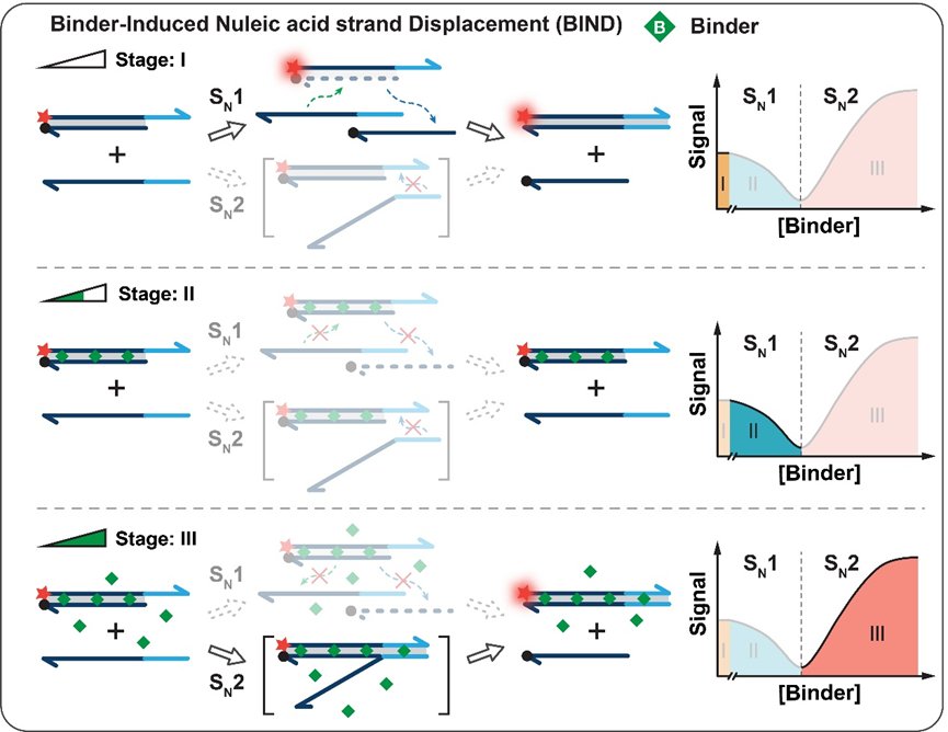 近日,永利李峰教授课题组以有机反应中亲核取代反应机理的视角,对该经典反应进行审视与重构:经典TMSD反应类似于SN2反应机理,而当环境中缺少金属阳离子时,链置换过程可与SN1路径类比。在此基础上,通过能够与DNA结合的小分子来代金属阳离子去实现链置换过程,并精准调节SN1和SN2反应路径。此类小分子通过插入或沟槽结合的方式与DNA的双螺旋结构结合,能够显著改变DNA的稳定性和功能,而且小分子与双链DNA(dsDNA)之间的相互作用是许多抗癌和抗感染药物的基础。本文中,首先验证了通过此类能够与DNA结合的小分子去介导链置换反应(Binder-Induced Nucleic acid strand Displacement, BIND)。结果显示,小分子与dsDNA的亲和力和其所带电荷能够精准控制链置换反应的路径。随后,进一步将这一全新链置换反应应用于DNA-小分子相互作用的系统、高通量表征,实现了结合常数(Kd)、结合位点大小(n)、协同性(ω)、焓(ΔH)和熵(−TΔS)的贡献以及序列选择性一系列特征参数的一站式综合分析。BIND还可以被设计成高通量筛选的工具,从大量化合物中筛选与DNA有特异性亲和作用的小分子化学物,并成功地从含有700个化合物的库中筛选出8个全新的DNA结合小分子。