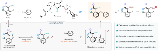 功能性轴手性化合物的构筑不仅是不对称催化的热点问题,而且也成为药物化学和材料化学领域的研究前沿。其中,轴手性醛类化合物由于其独特的药理活性及潜在的不对称羰基催化作用,近些年受到化学家们的广泛关注。目前这一研究方向的进展主要集中于轴手性芳基-芳基醛类化合物的不对称构筑;相比之下,对于乙烯醛-芳基化合物的催化不对称合成报道很少。其原因可能是轴手性乙烯醛化合物的旋转能垒较低,在合成及立体控制上具有一定挑战性。因此开发高效、简便的不对称反应方法构筑轴手性芳基乙烯醛化合物具有重要的科学意义和实际价值。