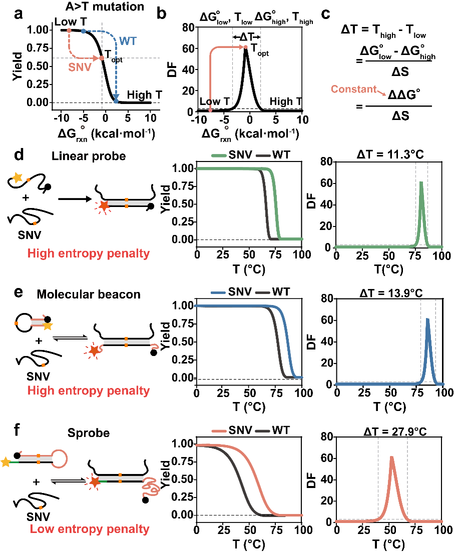 基因突变已被证实是疾病诊断和精准医疗的重要生物标志物。DNA杂交探针是突变检测的主要手段,主要通过探针与突变靶标和野生型靶标结合的热力学差异实现突变的区分。然而,对于传统探针,单碱基错配的热力学差异常常会被正确互补序列的热力学增益所掩盖,因此,突变检测通常在探针的熔点附近,探针的工作温度范围窄且温度较高。