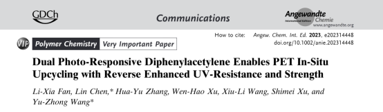 该工作以“Dual Photo-Responsive Diphenylacetylene Enables PET In-Situ Upcycling with Reverse Enhanced UV-Resistance and Strength”为题发表在《Angew Chem Int Ed》(2023, e202314448),并被遴选为VIP论文(Very Important Paper)。77779193永利官网为第一单位,第一作者为环保型高分子材料国家地方联合工程实验室的硕士范丽霞,通讯作者为陈琳研究员和王玉忠院士,研究得到国家重点研发计划(2021YFB3700203)和111计划(B20001)等资助。