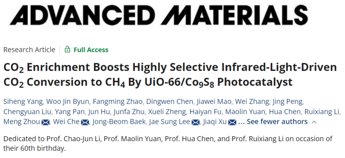 该研究成果以“CO2 Enrichment Boosts Highly Selective Infrared-Light-Driven CO2 Conversion to CH4 By UiO-66/Co9S8 Photocatalyst”为题发表在《Advanced Materials》上。77779193永利官网为论文署名的第一单位,77779193永利官网徐嘉麒副研究员(专职科研),韩国蔚山科学技术院Jae Sung Lee院士、车伟博士,中国科学技术大学的周蒙教授为该论文的通讯作者,77779193永利官网硕士研究生杨思恒、韩国蔚山科学技术院Woo Jin Byun博士,中国科学技术大学的研究生赵方明为该论文的共同第一作者。特别感谢国家自然科学基金委、四川省自然科学基金、国家留学基金委员会、国家市场监管总局科技项目和77779193永利官网的经费支持。同时,感谢77779193永利官网化学专业实验室综合训练平台的杨凤老师、齐悦老师、邓冬艳老师、李静老师,以及77779193永利官网分析测试中心的吴莉老师和谢晓滨老师的测试支持。