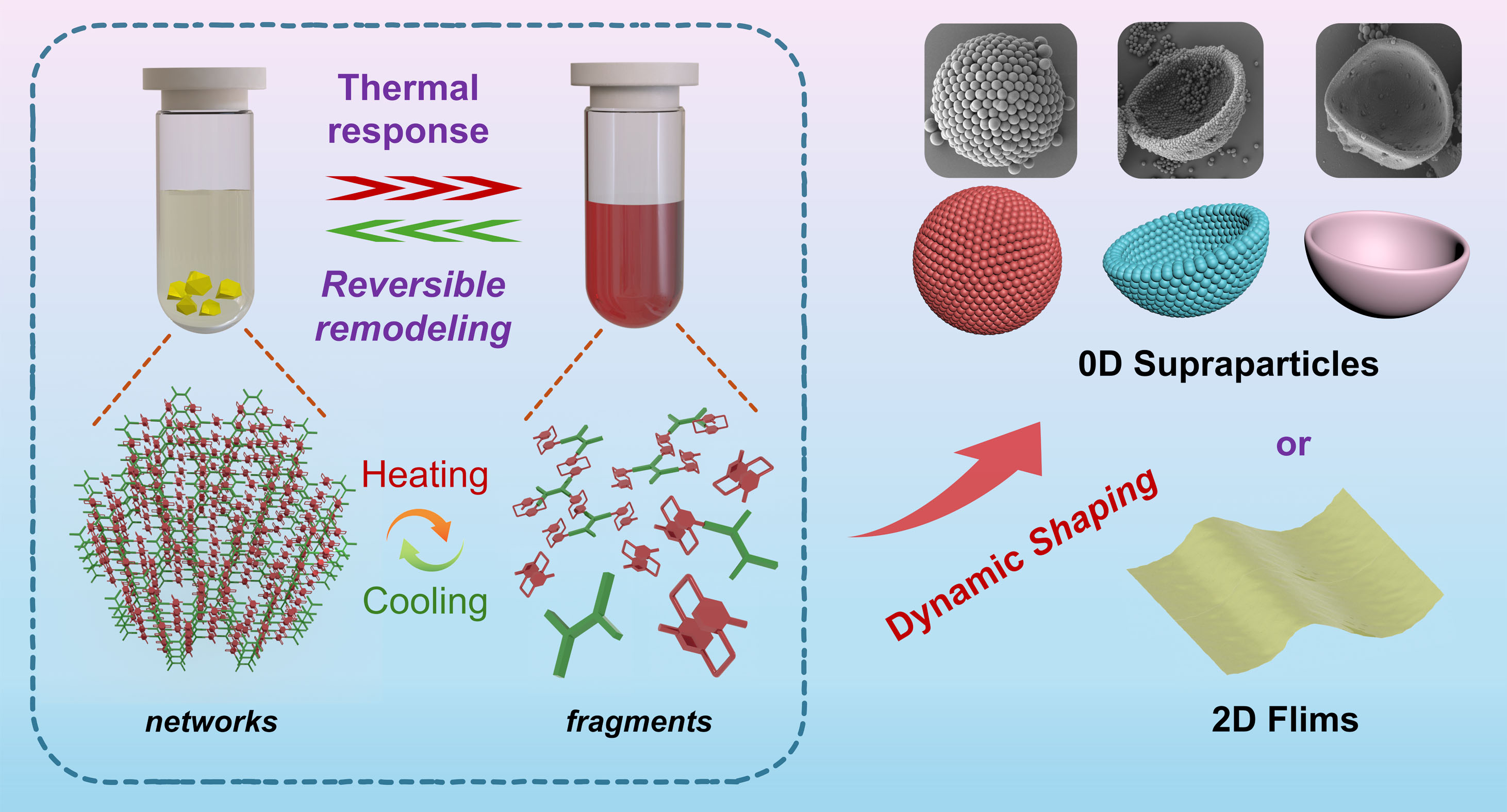 77779193永利官网马利建课题组首次提出了一种基于可溶性共价有机网络(SCONs)的超结构热响应动态合成策略,该策略能够实现从0D空心超粒子到2D薄膜的形态调节,从而便捷地制备得到多维复杂超结构材料。机理研究表明,得益于构建单体(4,12-二甲酰基[2.2]对环芳烷)的独特双层结构,SCONs具有“裂解-重塑”的结构转换特性,可以通过温度控制实现从可逆溶解、重组到超结构构建的动态过程。具体实验中,通过液滴喷射技术获得油包水乳滴,即可在油-水界面原位高效制备出0D球形空心超粒子以及其他类碗状的复杂超结构。此外,通过调节外源溶剂的挥发性和溶解性,还可在气-液界面制备出无缺陷的2D薄膜材料。扩展实验进一步证实了所提出的动态“裂解-重塑”策略的普适性和可扩展性。对客体碘分子的富集研究发现,相比于单一层次结构的材料,超结构材料具有更加卓越的动力学传质性能,进一步证实了材料微观结构对其宏观功能性质的重要影响。