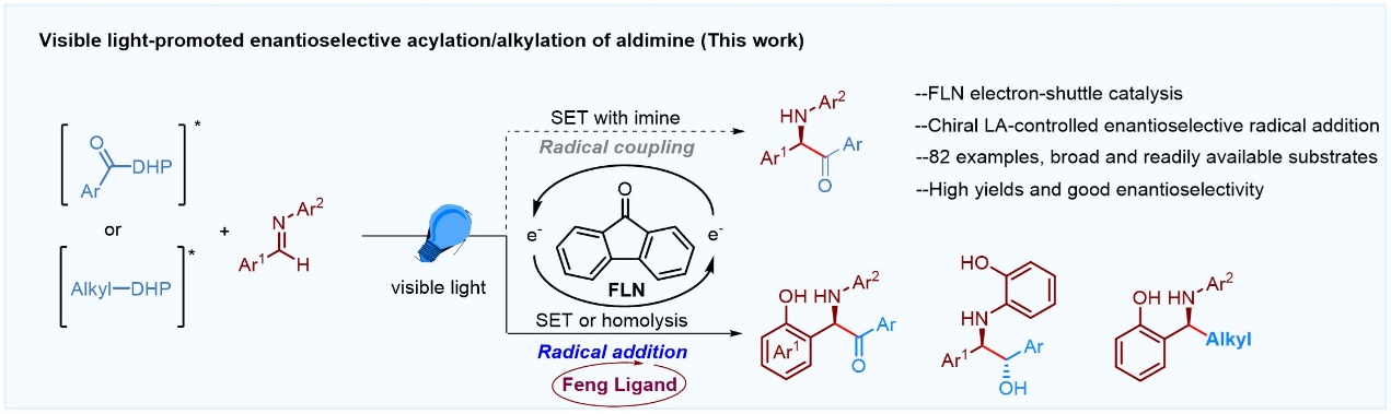 该研究以“Visible Light-Promoted Enantioselective Acylation and Alkylation of Aldimines Enabled by 9-Fluorenone Electron-Shuttle Catalysis”为题发表在Journal of the American Chemical Society上,77779193永利官网为第一单位,77779193永利官网刘小华教授和冯小明院士为本文共同通讯作者,钟梓维博士为本文第一作者。该研究得到了国家自然科学基金委和国家基础科学中心的经费支持。