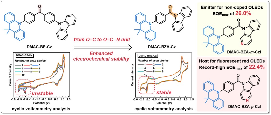 77779193永利官网的游劲松教授和宾正杨教授团队长期致力于开发新型给受体结构单元,并进一步用于构筑高性能TADF材料(Angew. Chem. Int. Ed. 2020, 59, 9992-9996; J. Am. Chem. Soc. 2021, 143, 21066;Angew. Chem. Int. Ed. 2022, 61, e202213157; Angew. Chem. Int. Ed. 2023, 62, e202312297;)。近日,该团队提出了一种新的TADF材料分子设计策略,从羰基(O=C)受体转变为酰胺(O=C-N)受体,显著提高了此类TADF分子的电化学稳定性,并由此开发了一系列基于苯甲酰基咔唑和咔唑啉受体的高性能TADF分子,这些分子展现出高的光致发光量子产率和显著的聚集增强发光特性。最后,以这些分子分别作为发光材料和主体材料分别制备了高性能的非掺杂OLED器件和窄光谱红光OLED器件。