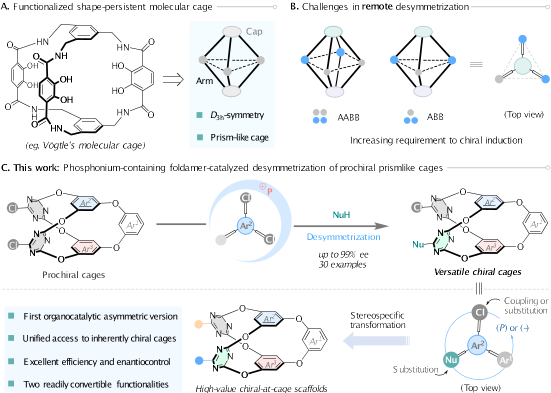 近日,永利王天利教授团队设计合成了一类结构柔性且高度可控可调的、具有二级螺旋结构的折叠体肽-季鏻盐催化剂。利用该有机折叠体催化剂,首次实现了潜手性有机分子笼的远程去对称化,精准构建了一系列结构丰富的手性分子笼化合物,为固有手性分子笼的催化不对称合成开辟了前所未有的途径(图1c)。