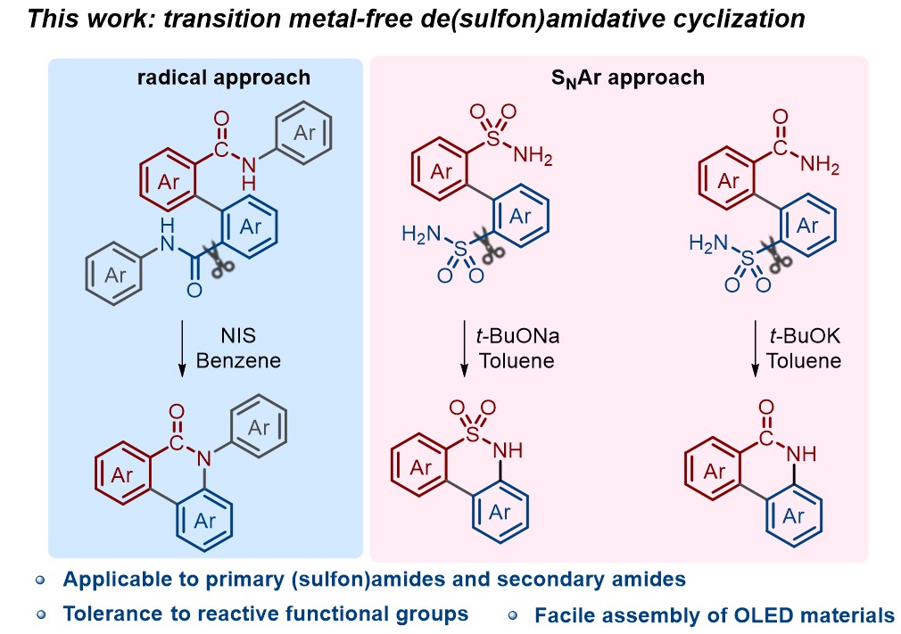 相较于其它羰基类化合物,如羧酸和羧酸酯等,酰胺类化合物由于酰胺键的共振稳定性而活化困难。以往的活化方法主要依赖于过渡金属催化的脱羰官能化反应。该方法通常需要使用具有强给电子能力和空间位阻的配体,以及活性较高的叔酰胺底物。近日,77779193永利官网的游劲松教授和杨宇东教授团队发展了一种自由基型联芳基二酰胺脱酰胺基环化反应,为直接脱酰胺基官能化方法及二苯并内酰胺衍生物的构筑提供了一种新的途径。沿着这一思路,该团队又开发了基于芳环亲核取代反应机制的联芳基二磺酰胺及同时含有酰胺和磺酰胺基团的联芳基化合物的脱磺酰胺环化反应,实现了一系列二苯并内磺酰胺衍生物和二苯并内酰胺衍生物的构筑。这些方法无需过渡金属的参与,对包含卤素在内的多类反应性官能团具有良好的兼容性。作者将获得的二苯并内酰胺和二苯并内磺酰胺骨架作为受体单元,分别构筑了热活化延迟荧光(TADF)分子DMAC-PDO和DMAC-BTZ。其中,以DMAC-PDO作为发光分子的OLED器件的最大外量子效率(EQEmax)为23.1%。该方法为温和条件下的惰性化学键活化提供了新的途径。