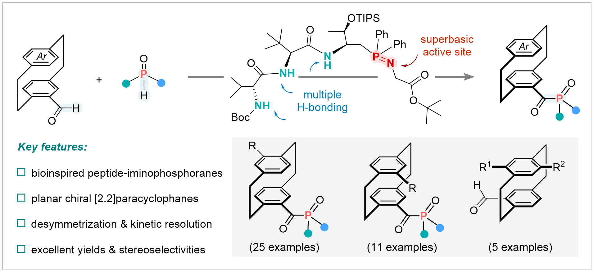 近日,永利王天利教授团队通过合理设计并开发了一类新型的手性肽-膦亚胺(PIMPs)超强碱催化剂,利用该有机强碱催化剂的协同作用,实现了不对称Pudovik加成反应和氧化反应的复杂串联过程,分别以去对称化和动力学拆分方式高效高选择性合成了一系列取代的[2.2]对环蕃分子(图1)。