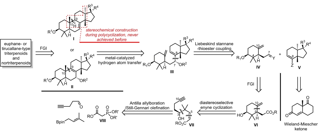 逆合成分析表明(图2),诸如 1 - 6 的大戟烷型和甘遂烷型三萜可由中间体 I 或 II 生成,而中间体 I 或 II 可通过中间体 III 经 MHAT 反应构建 C9 - C10 键来制备。中间体 III 可由钯催化中间体 IV 和 V 的 Liebeskind-硫酯偶联反应制得。中间体 IV 可由中间体 VI 构建,其 C5-C10 键可通过中间体 VII 的非对映选择性自由基环化反应形成。化合物 VII 可由戊- 4 -炔醛、异丙基硼和磷酸酯 VIII,经对映选择性的Antilla烯丙基硼化和 Still-Gennari 烯化反应制备。中间体 V 可由市售的Wieland-Miescher 经骨架重排合成。