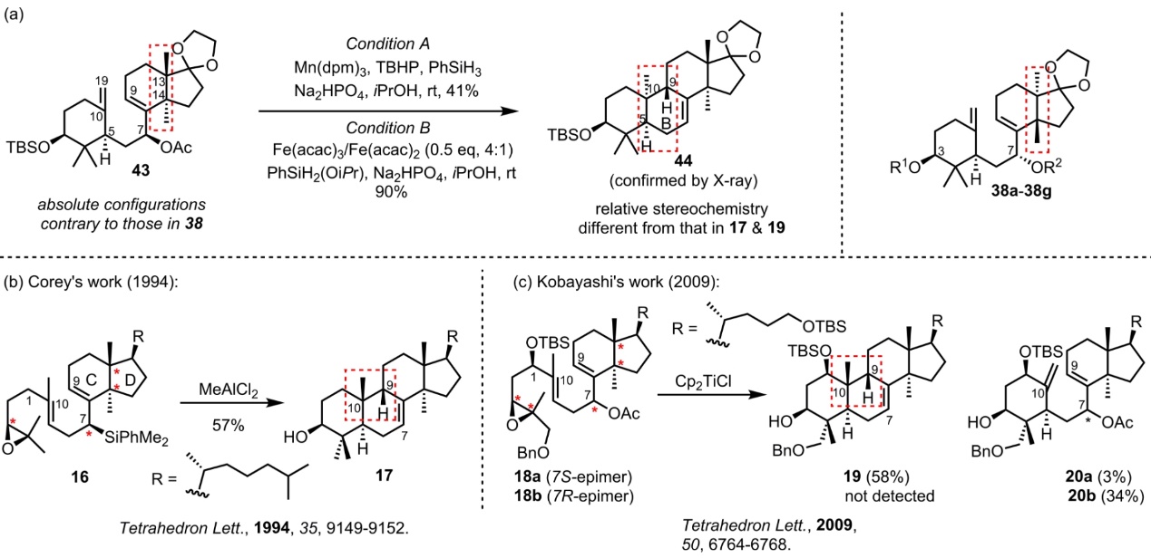 通过大量条件筛选发现,在基于金属铁的MHAT条件下可生成环化消除产物,而在基于金属锰的MHAT条件下则生成环化异构化产物,这些环化产物分别构成大戟烷、甘遂烷三萜四环骨架。值得注意的是,与 38 相比,在 C13/C14 位有相反绝对构型的化合物 43,在两组条件下均只生成环化-消除产物 44,而 43 的 C7 差向异构体仅生成 C10/C19-二氢化产物(图4a)。与已报道多烯环化产物 17 和 19(图4b/c)相比,44 在 C5、C9 和 C10 位显示出不同相对立体化学,这表明本工作与已报道阳离子和自由基多烯环化在立体化学上存在差异。