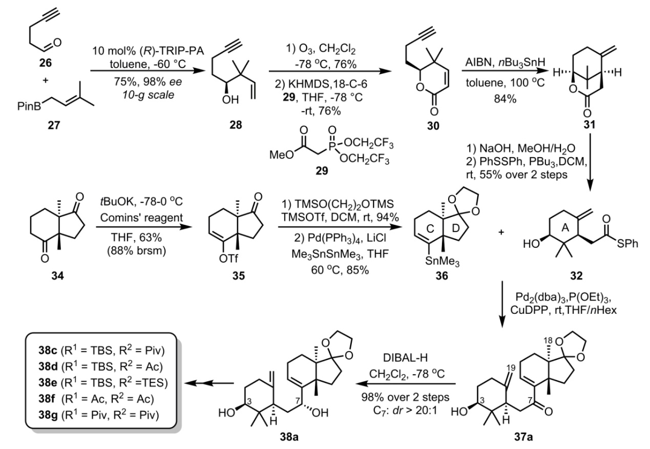 合成从醛化合物26和烯丙基硼27出发,在手性磷酸催化的Antilla烯丙基硼化反应和分子内自由基环化反应等转化构建A环片段32。CD环片段从已知化合物34出发,通过两步转化为三氟甲磺酸酯,接着利用钯催化锡基化反应,生成偶联前体36。片段32和36在钯催化Liebeskind 锡烷-硫酯偶联反应条件下,实现A环与C/D并环连接,并制备一系列MHAT环化反应前体(图3)。