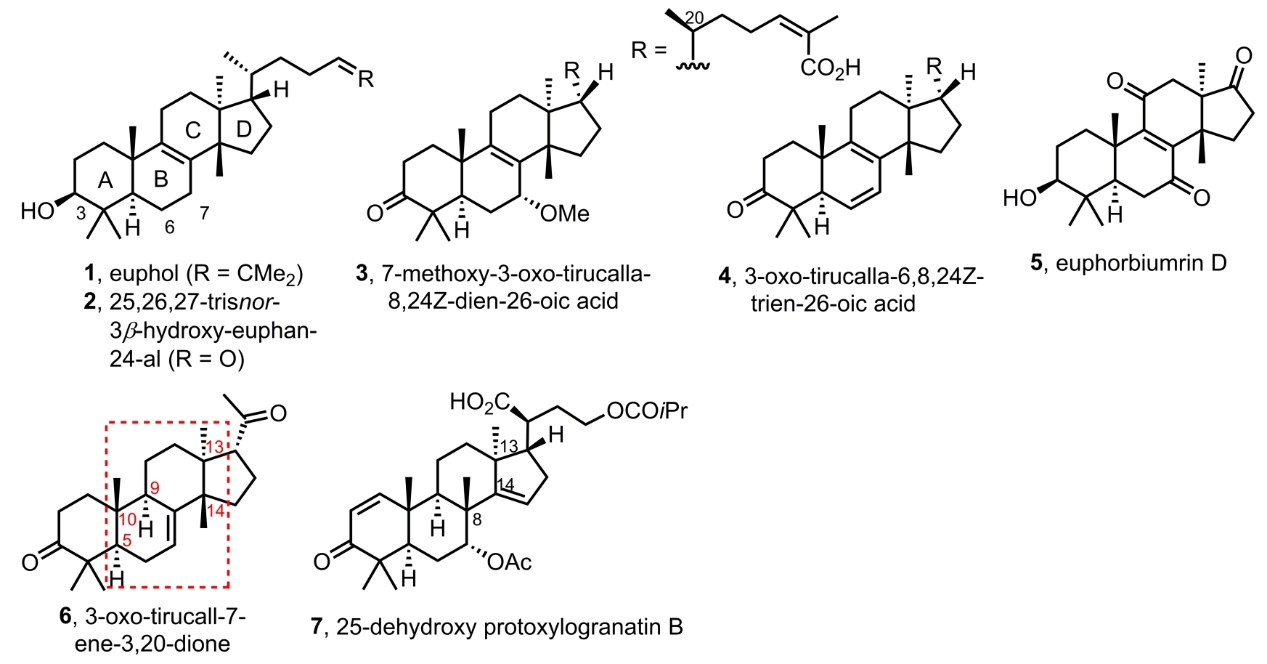 图1代表性的大戟烷、甘遂烷和脱甘遂烷三萜化合物