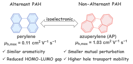 有机半导体因其在有机场效应晶体管、有机发光二极管、有机光伏等领域的潜在应用而备受关注。鉴于有机分子结构的多样性和易于修饰的优点,合理开发新型有机π共轭骨架来扩大和完善有机半导体材料是势在必行的。近年来非交替多环芳烃也受到广泛关注,其中交替的萘(苯型)和非交替分子薁(非苯型)可以通过异构化转化。近年来,科学家对开发新的薁基衍生物及非苯型多环芳烃的研究兴趣日益增长,然而基于薁的直接功能化制备新型多环芳烃是一个挑战。
