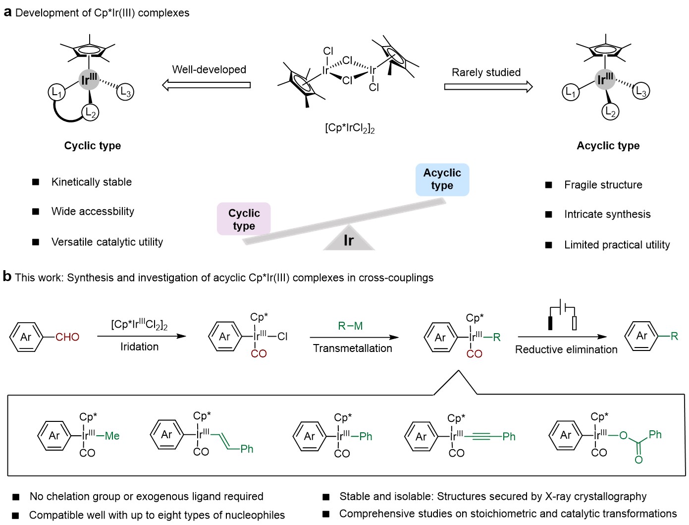 近日,游劲松教授/谭光映研究员团队揭示了一种高效构筑各种稳定的非环状Cp*Ir(III)配合物的合成方法。利用商业可得的芳香醛类化合物作为原料与[Cp*IrCl2]2发生铱化反应,可直接一步获得一系列稳定的非环状芳基 Cp*Ir(III)(CO)Cl配合物,这一过程中芳香醛脱羰产生的一氧化碳作为配体稳定金属配合物,无需外加其他配体。生成的芳基 Cp*Ir(III)(CO)Cl配合物具有优秀的反应性,可与芳基/烯基硼酸、芳基/烷基镁试剂、芳基/烷基锂试剂、芳基锌试剂、芳基硅试剂、芳基锡试剂、端炔、羧酸等多达八种亲核试剂发生转金属反应,生成芳基-Ir-烷基,芳基-Ir-芳基,芳基-Ir-烯基,芳基-Ir-炔基,芳基-Ir-酰氧基等五类二有机铱配合物。随后作者对这些二有机铱物种进行了循环伏安测试和电化学研究,最终通过电氧化的方式实现了这些二有机铱配合物的还原消除,成功获得了相应的偶联产物。基于对这些有机铱配合物的当量转化的研究,作者成功发展了Cp*Ir(III)促进/催化的C–C和C–O偶联反应。该结果为铱参与的偶联反应提供了一个重要的研究平台,为开发新的三价铱催化的偶联反应奠定了基础。