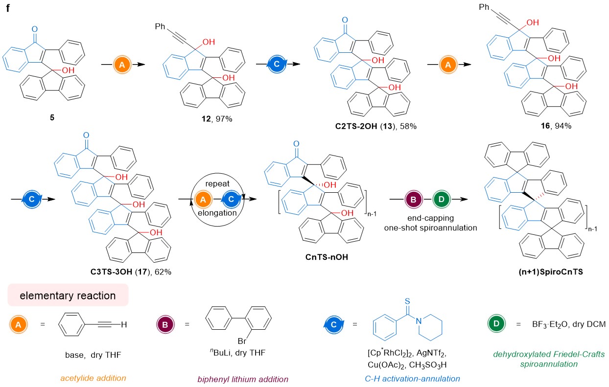 利用手性保持的傅克螺环化反应,作者开发了一种迭代合成策略,用于纯碳氢共轭螺环的立体专一性合成。首先使用铑催化的区域选择性C−H活化/环化反应制备手性叔醇前体。最后,每个手性叔醇单元通过立体专一性转化形成螺环结构,就像完成一个“拉链闭合”的过程。