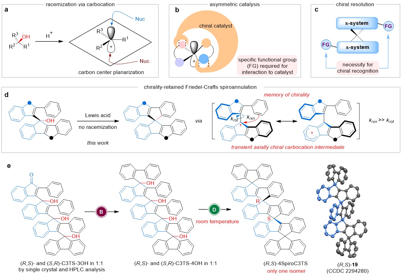 螺环骨架的固有刚性和空间位阻特性使其在手性化学中具有重要价值,能够提供构象稳定性和特殊的手性微环境。然而,通过分子内傅克烷基化型螺环化反应,从手性叔醇构建手性螺环一直被认为不可行,因为平面构型的碳正离子中间体的形成会导致立体化学信息的丢失(图a)。现有的手性螺环合成策略主要依靠不对称催化或外消旋螺环混合物的手性拆分。这些方法通常需要特定官能团(如酚羟基)来实现立体控制,限制了对于缺乏此类官能团的底物的适用性(图b-c)。当目标化合物为含有多个螺碳中心的手性化合物时,挑战进一步加剧,因为手性元素数量的增加会产生一系列难以控制和拆分的复杂手性异构体。