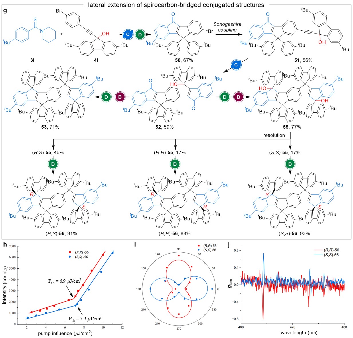最后,作者利用该迭代合成策略进行螺环结构的横向延伸,制备了基于低聚(对亚苯基亚乙烯基)的手性纯碳氢共轭螺环。这些手性螺环化合物表现出优异的光物理性质,使其能够应用于圆偏振激光。
