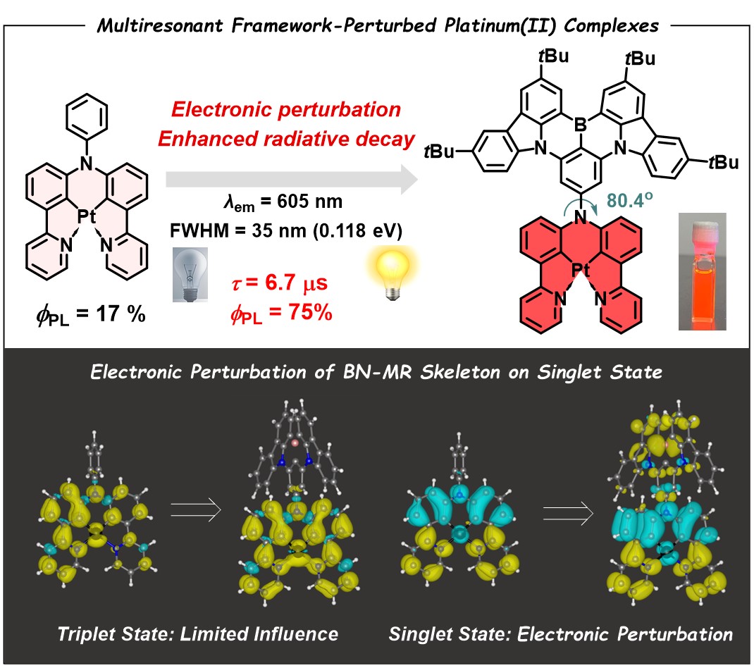 近日,77779193永利官网游劲松教授团队的宾正杨教授、高戈教授与苏州大学陈先凯教授合作,提出了一种利用硼氮骨架对金属铂配合物进行微扰以增强磷光的策略,成功构筑了新型高效窄光谱红光发光材料体系。研究发现,将硼氮骨架与弱发光的铂配合物进行正交结合,可以在基本维持磷光三线态发光波长和半峰宽的前提下,硼氮骨架的单线态强辐射跃迁可有效增强磷光跃迁偶极矩,从而显著提升发光效率。该工作不仅开发了一类新型高效的窄光谱红光磷光材料体系,更揭示了一种基于硼氮骨架与铂配合物微扰的发光增强机制,为发展高性能窄光谱磷光材料提供了新思路。
