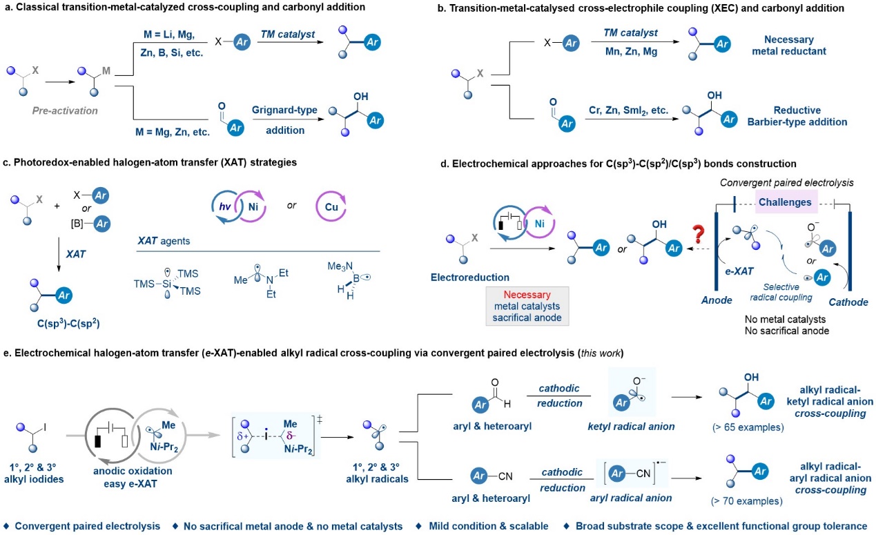 郑柯课题组基于自己发展的电化学卤原子转移(e-XAT)策略,考虑到成对电解可高效构建C(sp³)–C(sp3)/ C(sp3)键,进一步通过成对电解策略实现了电化学卤原子转移(e-XAT)促进的直接烷基自由基交叉偶联,进而拓展了该(e-XAT)策略并应用于芳基/杂芳基醛或氰化物的交叉偶联。在该体系中,阳极产生的α-胺烷基自由基通过卤原子转移(XAT)活化非活化烷基碘化物生成烷基自由基,同时芳基/杂芳基醛或氰化物在阴极还原,生成相应的羰基自由基离子或氰基自由基负离子,利用成对电解策略,通过高效速率匹配的阳极氧化和阴极还原,在无过渡金属催化、无需牺牲阳极的电化学卤原子转移(e-XAT)条件下,经历自由基-自由基离子交叉偶联,高效、选择性的实现C(sp³)–C(sp3)/C(sp3)键的构建,在简单、温和的电化学成对电解条件下实现了多种结构多样化醇及C(sp³)–C(sp⟡)偶联产物的构筑。该电化学卤原子转移(e-XAT)成对电解新策略条件简单、温和、易于放大,具有良好的官能团耐受性,适用于多种结构多样化的一、二、三级烷基碘化物及芳基/杂芳基醛或氰化物,并在多种天然产物、生物分子及药物的后期修饰中展现出重要应用潜力。
