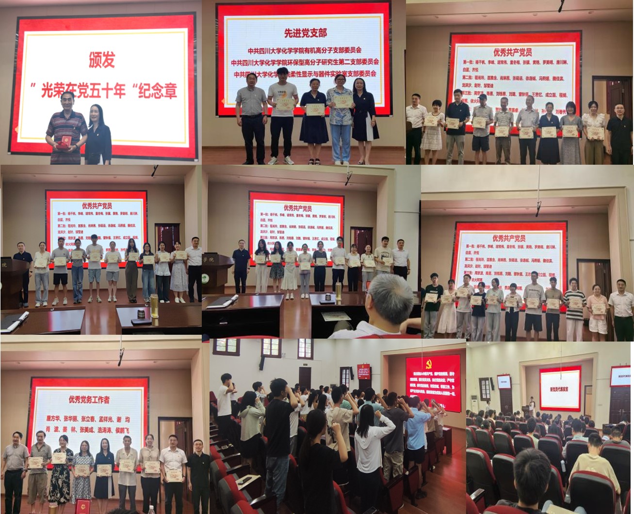 学院党委副书记肖波宣读表彰决定。党委书记谢均为谢明贵同志颁发“光荣在党50年”纪念章。院领导为先进党支部、优秀共产党员、优秀党务工作者代表颁奖。