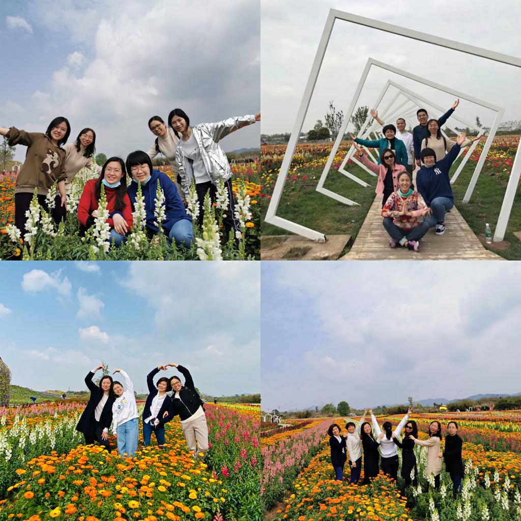 在春游赏花活动中,老师们三五成伴,于花田间信步穿行,欣赏春日风光,不时驻足用手机定格美颜美景,尽情放飞愉悦心情。