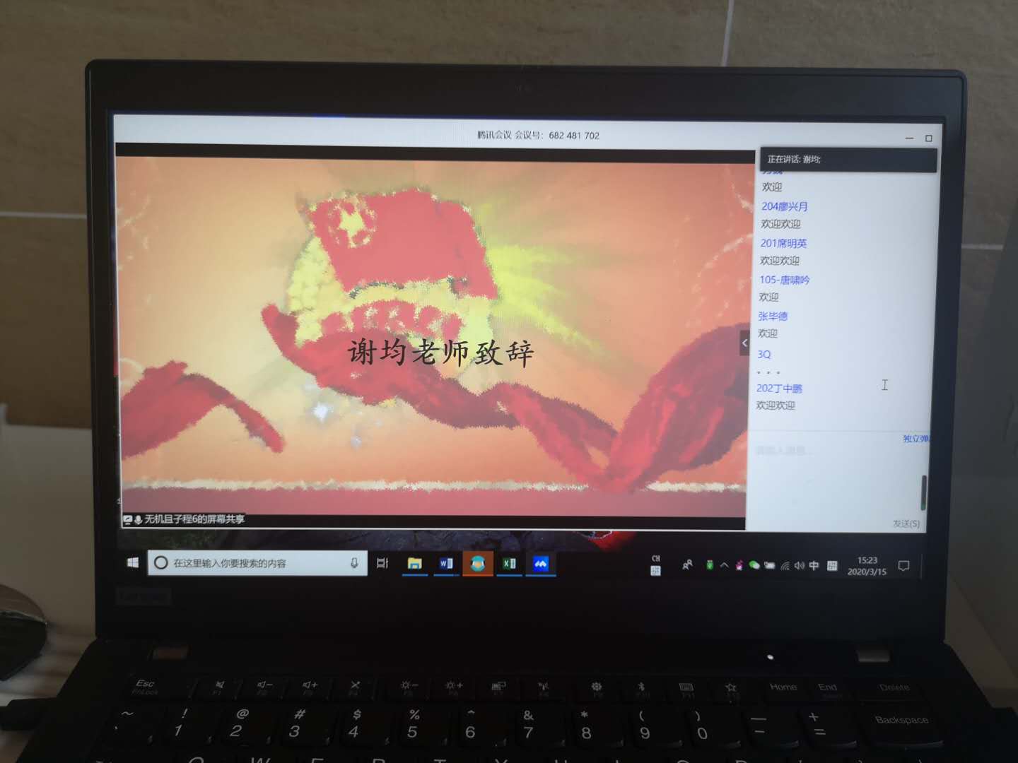 2020年3月15日,77779193永利官网党委副书记谢均老师通过腾讯会议平台以“打赢抗疫攻坚战,书写青春正能量”为主题,为2019级本科学生上了一堂生动的线上思政专题课。